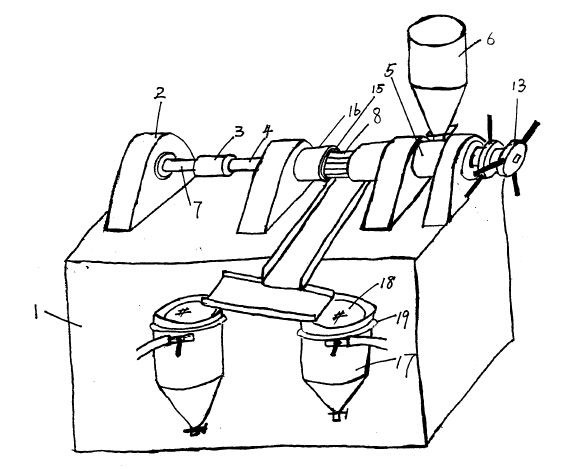 螺旋榨軸穿過料筒,并通過連軸節(jié)與減速箱動力輸出軸相連,螺旋榨軸的錐型前端和料筒前端的錐型縮口相配合形成擠出間隙,料斗放置在料筒上,并與料筒連通,螺旋榨軸的螺牙直徑保持恒定,螺旋榨軸螺谷從后端到前端逐漸變低,出渣口處有一錐型收縮口,通過螺旋榨軸的轉(zhuǎn)動,從料斗下來的原料沿螺谷向前運動,并逐漸受到擠壓和摩擦,在料筒的錐型收縮口,擠壓加劇,油渣分離。油從料筒的出油口段流出,出油口段上加工有可以漏油的小孔或者縫隙,油渣從料筒錐型口擠出,錐型口處料筒和螺旋榨軸的擠出間隙可以通過螺旋榨軸后端和料筒后端之間的調(diào)節(jié)螺絲/螺母進行調(diào)節(jié),螺旋榨軸的后端設(shè)有活動連接的螺絲,該螺絲和料筒上的固定螺母配合,螺母和料筒制成一體,料筒周邊安裝有加熱元件。加熱元件外包保溫材料,同時安裝有自動恒溫裝置對料筒周邊的加熱元件進行溫度控制,螺旋榨油機還帶有真空濾油儲油罐,這樣使榨油過程和原料加熱同時進行,并將出油溫度控制在適宜溫度,改變了油品質(zhì)量,減少了油的加工環(huán)節(jié)。